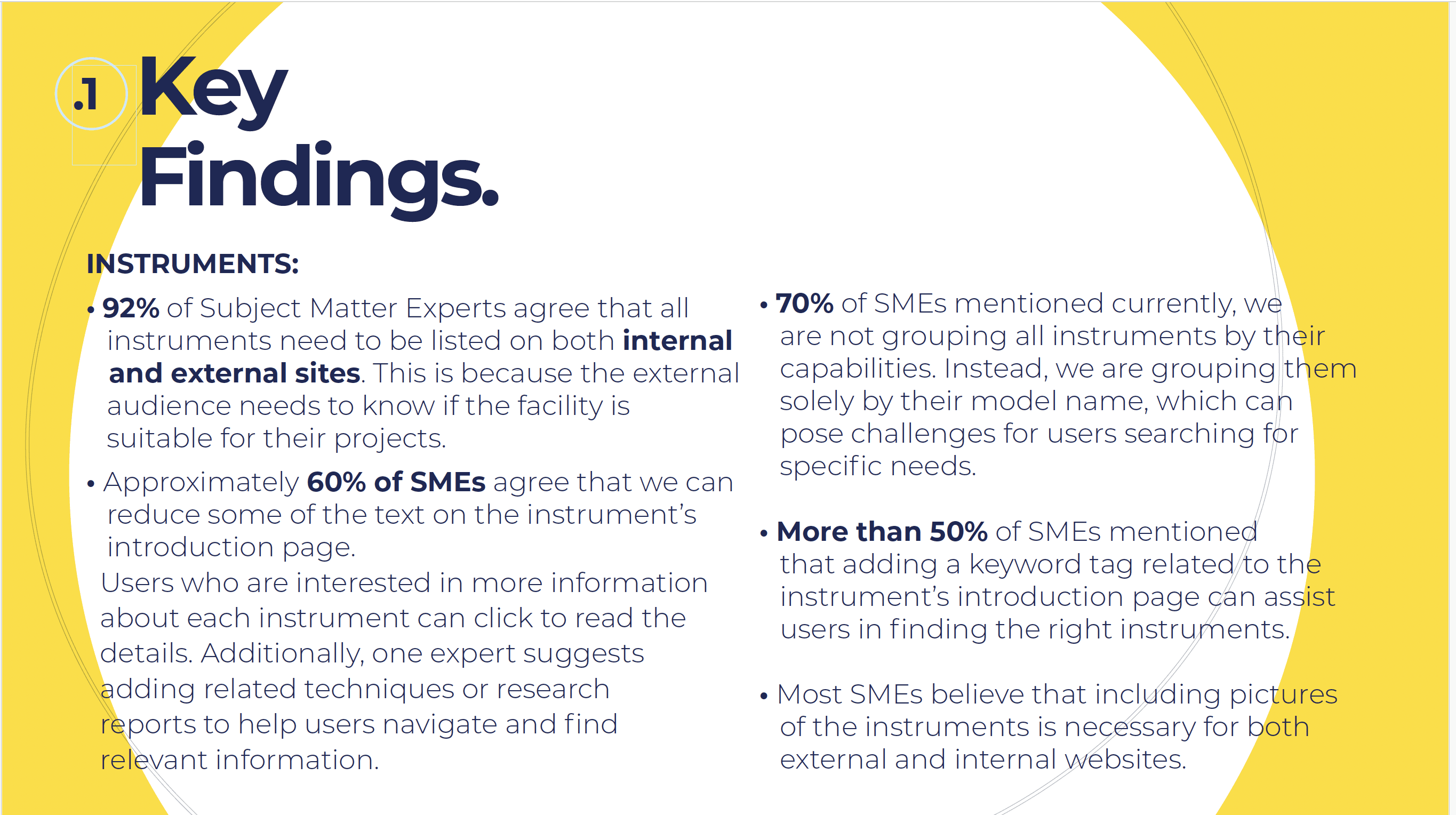 • SMEs emphasised instrument visibility: 92% SMEs agreed that Instruments need to be discoverable for both UNSW users and external audiences.